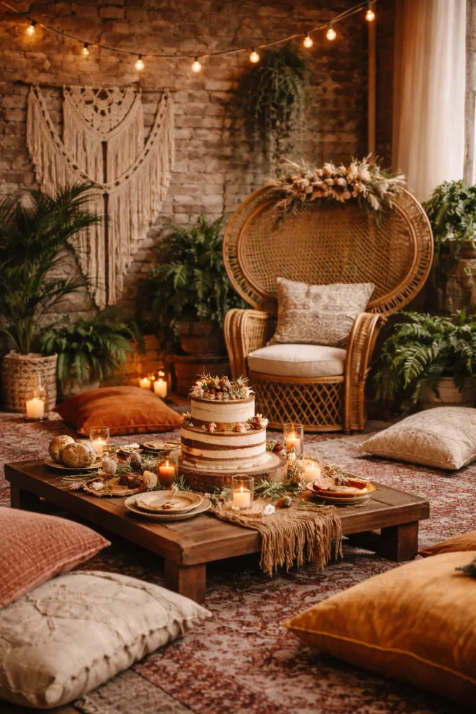 Decor Ideas: Macramé wall hangings and backdrops, floor seating with colorful pillows and blankets, potted plants and greenery scattered throughout, bohemian textiles and rugs, rattan and wicker furniture, natural wood tables, string lights for ambiance, dreamcatcher decor, tapestry displays.