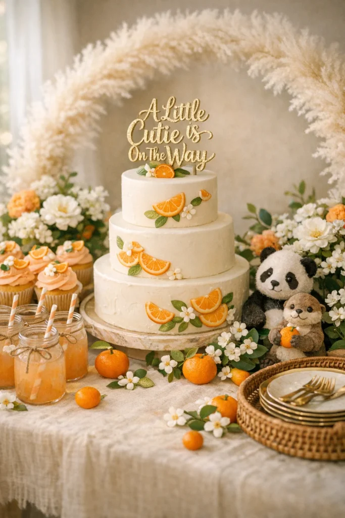 Theme Elements: Cutie-shaped cake toppers, orange blossom decor, adorable animal companions (baby pandas, otters, or chicks), pastel orange and cream color scheme, sweet signage (“A Little Cutie Is On The Way”), playful bunting and garlands.