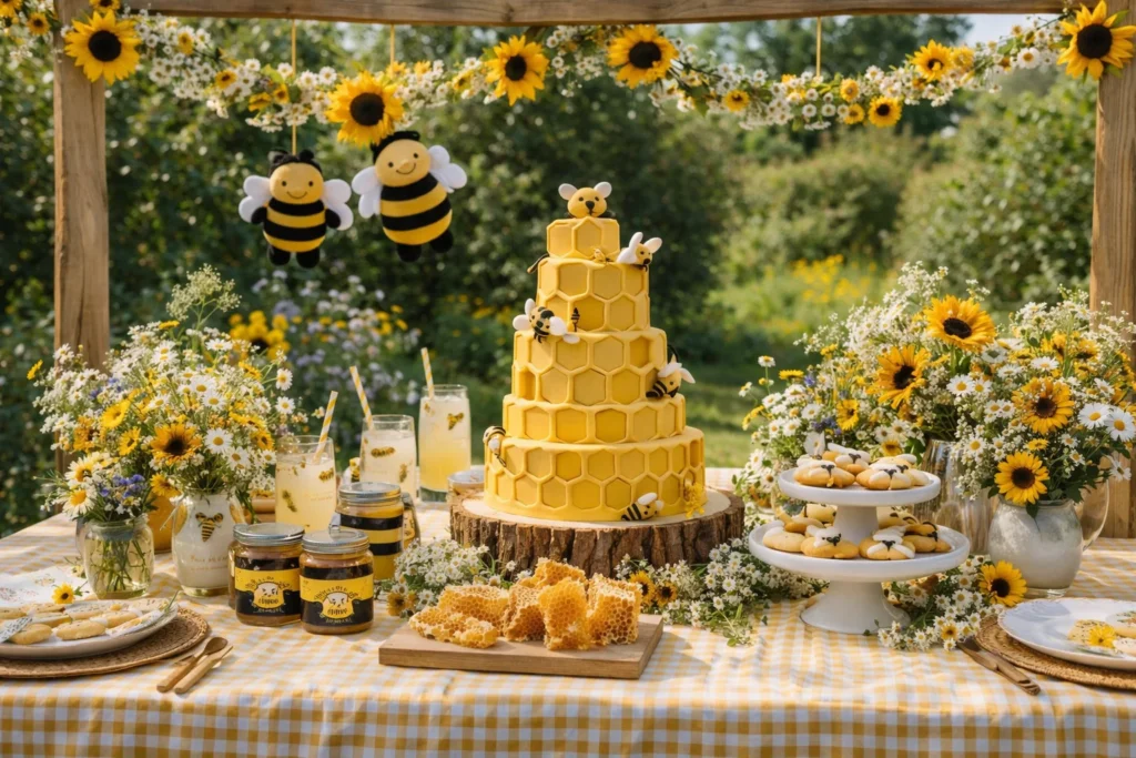 Decor Ideas: Bee-shaped balloons and decor, honeycomb patterned table runners or backdrops, golden honeycomb installations, bee and flower centerpieces, honey jar displays with labels, bee-themed invitations and signage, flower garlands with bee accents, honey-flavored treats throughout.